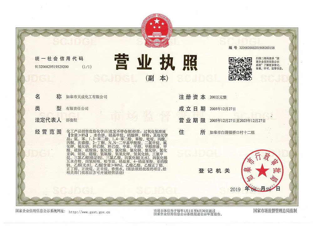 ? 如皋市天成化工有限公司創(chuàng)建于1996年。公司地處于美麗富饒的長江三角洲,座落在古鎮林梓,通揚運河河畔。南瀕長江、西臨204國道,距南通港、飛機場30公里,立體交通發(fā)達。公司經營管理規(guī)范,技術力量雄厚,擁有一批高、中級專業(yè)技術人才。